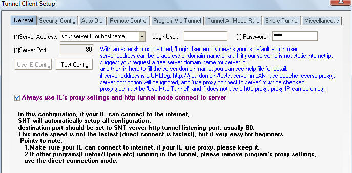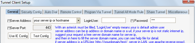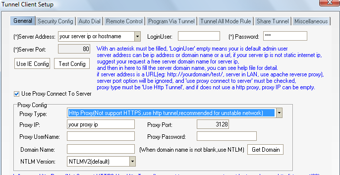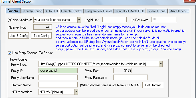 First, server listen at 80, 100, 443 ports and check 'Use http tunnel listen on port 80'